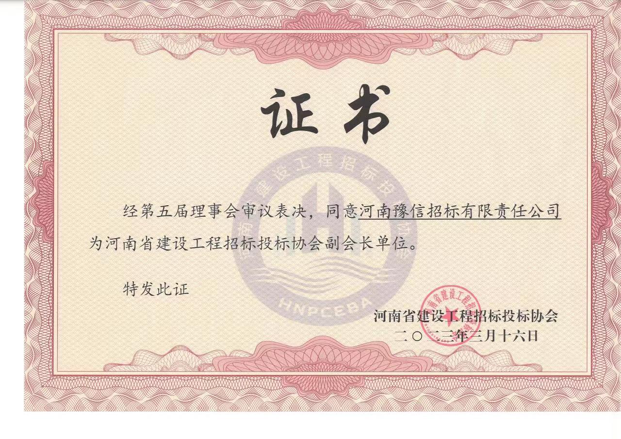 經(jīng)第五屆理事會審議表決,同意河南豫信招標有限責任公司為河南省建設工程招標投標協(xié)會副會長單位。 -